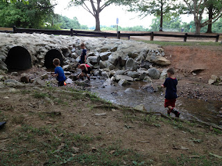 Today we met some old friends from Alabama at a cool little park by our house. We packed a picnic lunch and had a blast. The park has a great playground and basketball courts etc. but the biggest hit is this little creek that runs through it full of rocks to climb and play on. Literally, my friend Kerry and I set up chairs on the side and chatted while they played in the water for almost 3 hours. They loved every second of it and were begging to stay longer. We should have worn swimsuits because they were sopping wet after about 5 minutes in the water. That is why they are missing shirts in some of these pictures.
